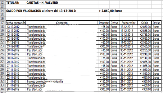 Os animamos a seguir colaborando con la campaña de donativos navideña. Como imaginábamos, la respuesta de los germanos y vecino está siendo muy positiva. Queda tiempo, pero si aún no las hecho, colabora con la cantidad que puedas. Publicamos el extracto de hace unos días para que comprobéis el estado de la cuenta. Para salvaguardar la identidad de los donantes hemos borrado sus nombres. Adelante con la caridad cristiana. ¡Feliz Navidad!