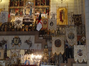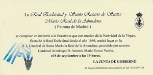 El pasado 8 de septiembre La Real Esclavitud y Santo Rosario de Santa María Real de la Almudena celebró su fiesta en la catedral de Madrid, que lleva su nombre. La Hermandad Nuestra Señora de Valverde asistió invitada por la Hermandad vecina. Varios hermanos nos representaron durante la Eucaristía presidida por el cardenal de Madrid, D. Antonio María Rouco Varela, durante la fiesta litúrgica de la natividad de la Virgen María. Una hermosa celebración que compartieron con el resto de hermandades y cofradías de Madrid, representadas simbólicamente con sus respectivos estandartes.